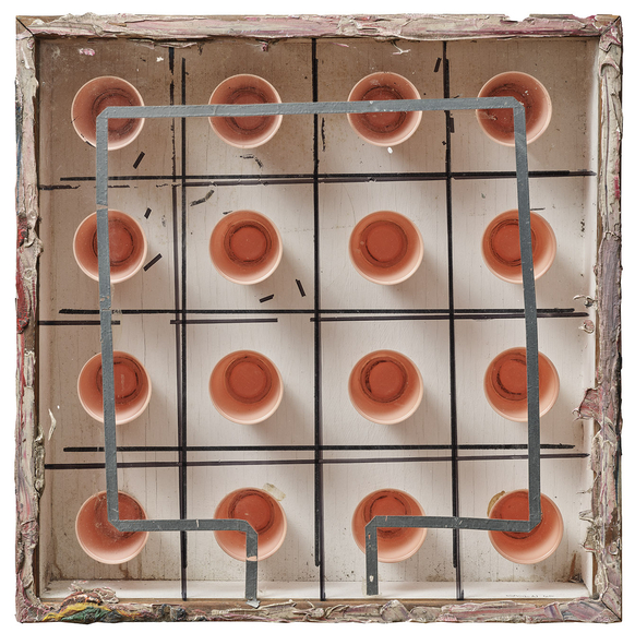 The Cup is a Basen (Box), 1960s, Wood, glass, tape and plastic cups